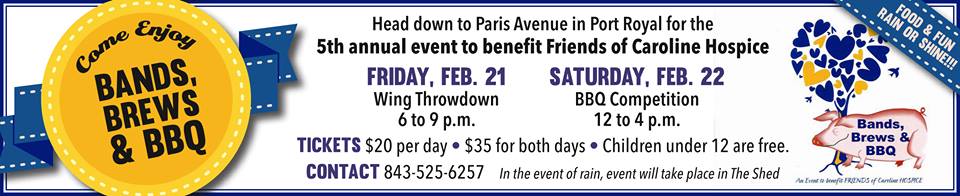 Beaufort Memorial Hospital presents the 2021 Bands, Brews & BBQ, bringing two days of food, music, and fun with wings, barbecue, beer, live music and fun for the entire family. This official South Carolina Barbecue Association sanctioned event kicks off the 2020 season and benefits FRIENDS of Caroline Hospice.