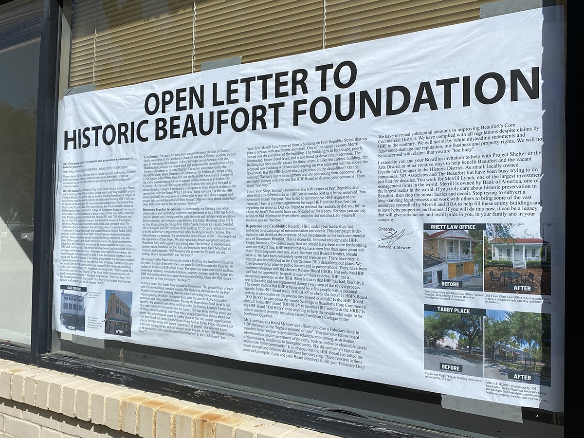 Reputation and Credibility: Recently HBF, under your leadership, has embarked on a campaign of misinformation and deceit. This campaign is designed to cast doubt on the propriety of our investments in the core commercial area of Downtown Beaufort. This is shameful, immoral and demeans HBF. Simply because a few elitists imply that we should have been more forthcoming does not make it true. HBF implies that we have been less than open about our plans. That’s hogwash, and you, as a Chairman and Board Member, should know it. We have been completely open and transparent. There have been at least 28 articles published in the Gazette since 2013 describing our plans. We have discussed our plans in public forums and in presentations. There have been numerous meetings with the Historic Review Board (HRB). Not only has HBF staff had the opportunity to speak at each of these reviews, HBF has a designated appointee on the HRB. What is true is that HBF has had, literally, a seat at the table and was represented during every step of the review process. The simple truth is that HBF is being used by a few people with a personal agenda. Is the HBF Board really TOO BUSY to check the facts? Is HBF’s Board seeking to cast doubts on the process they helped establish? Is the HBF Board ‘TOO BUSY” to care about the vacant buildings in Beaufort’s Core Commercial district? Is the HBF Board TOO BUSY to monitor HBF actions at the HRB? Is the HBF Board TOO BUSY to do anything to help the people who want to be able to use their property including vacant Freedman’s Cottages in the Northwest Quadrant.
