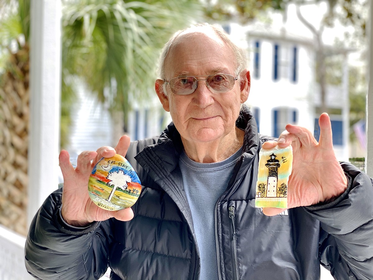 Sea turtles, lighthouses, campgrounds, school buses, whimsical characters, and Lowcountry scenes are just some of the images enjoyed by those who are lucky enough to discover one of Rick’s Rocks. Artfully painted by St. Helena resident Rick Smith, the 71-year-old retiree recently began hiding his colorful rock creations on Hunting Island and other Beaufort locations.